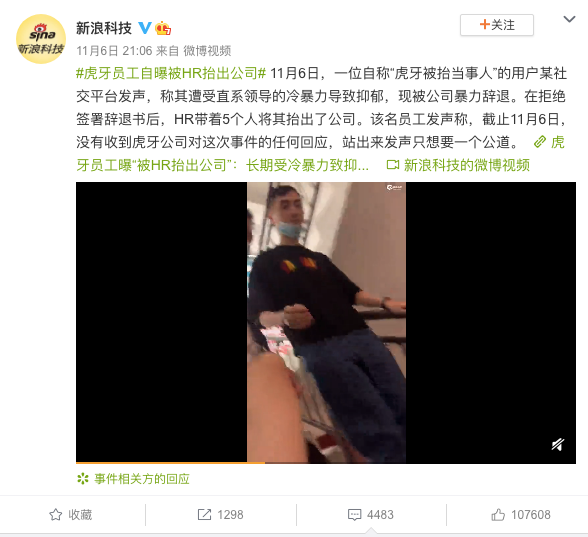 被裁员的当事人在网上发布视频,称因为拒绝签署辞退书,被虎牙公司的HR带着5个人抬出了公司。
