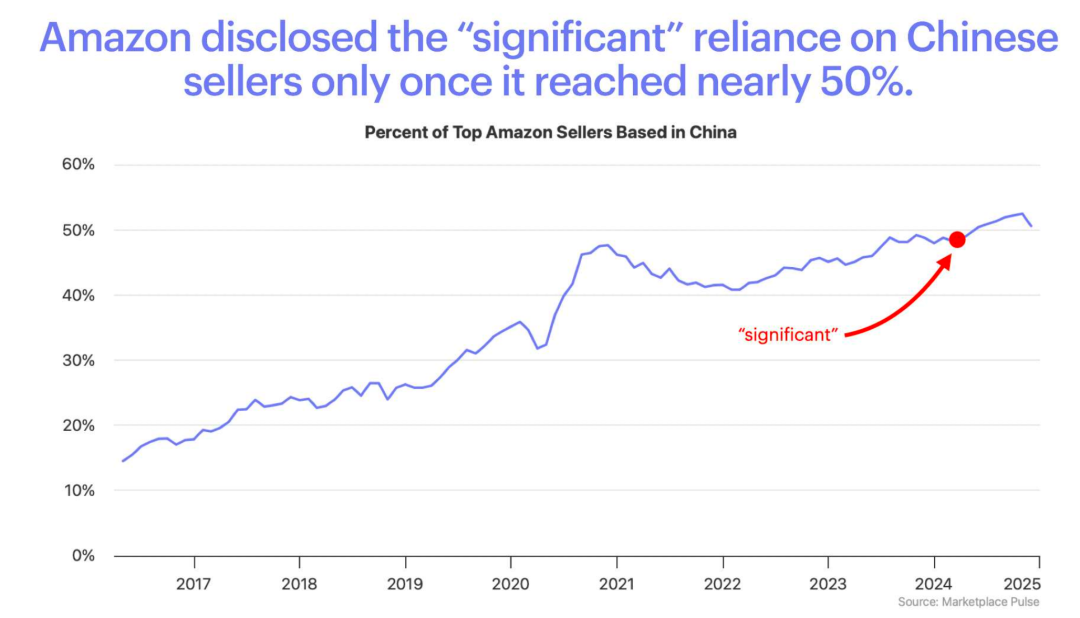 2月,亚马逊在向美国证券交易委员会提交的年度10-K表格中,首次承认了中国卖家在平台的重要地位,并称其“相当可观”。根据Marketplace Pulse的研究,中国卖家现在占亚马逊顶级卖家的50%以上,美国卖家约占 45%,其余卖家在英国、加拿大或其他国家。