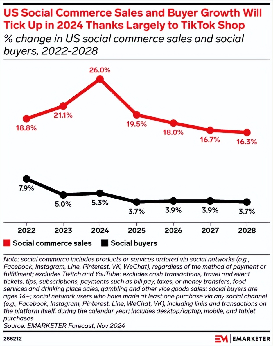 TikTok的崛起推动了美国社交电商的快速增长。eMarketer数据显示,到2024年,美国的社交买家数量将超过1亿,TikTok Shop于2023年9月在美国推出,成为2024年社交买家和销售额增长的最大贡献者。