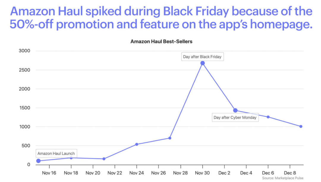 《华尔街日报》援引知情人士的话称,亚马逊开始将Shein和Temu视为比沃尔玛等零售商更大的威胁。亚马逊Haul几乎全面对标Temu,主打售价低于20美元、重量小于1磅的白牌商品,旨在吸引那些想要省钱并愿意等待更长时间的消费者。亚马逊Haul在黑色星期五期间因50%的折扣促销和应用主页的推荐而激增。