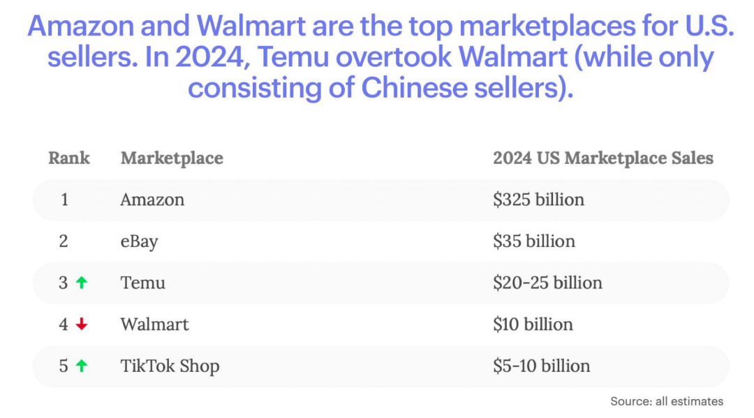从销售额来看,2024年,Temu在美国市场的销售额为200亿~250亿美元,排名第三,已经超越沃尔玛,仅次于亚马逊和eBay,TikTok Shop则排名第五。如果两家公司能在美国顺利运营,TEMU有望在流量超过eBay后,在销售额方面也超越eBay,而TikTok Shop则有望超越沃尔玛,两家公司在一步步改变美国电商市场竞争格局。