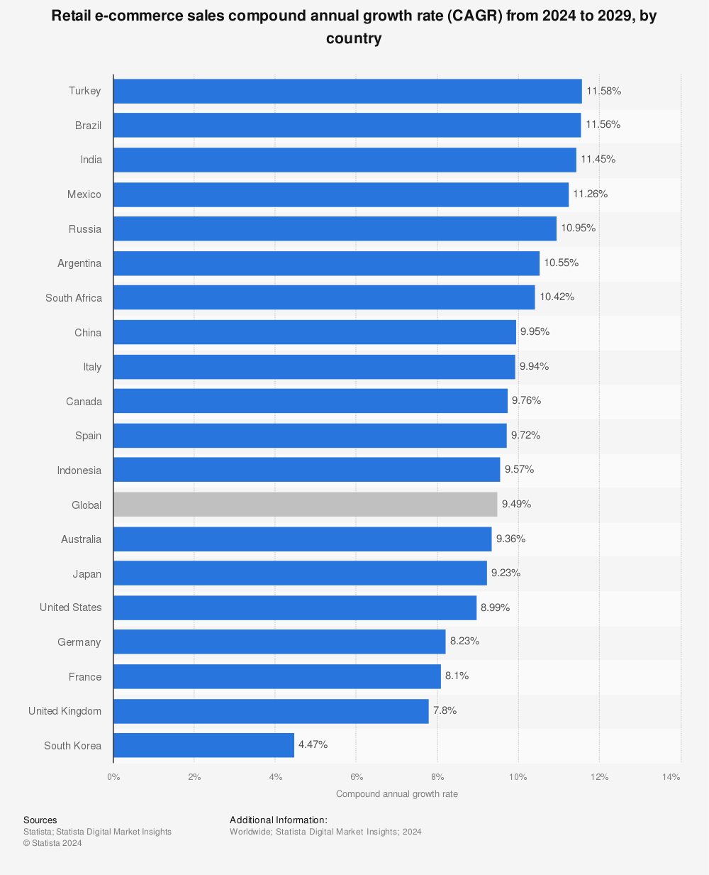 拉美同样如此。根据Statista统计,2024~2029年,预计电商销售额增长最快的五个国家,分别是土耳其、巴西、印度、墨西哥、俄罗斯。其中巴西、墨西哥均属于拉美。