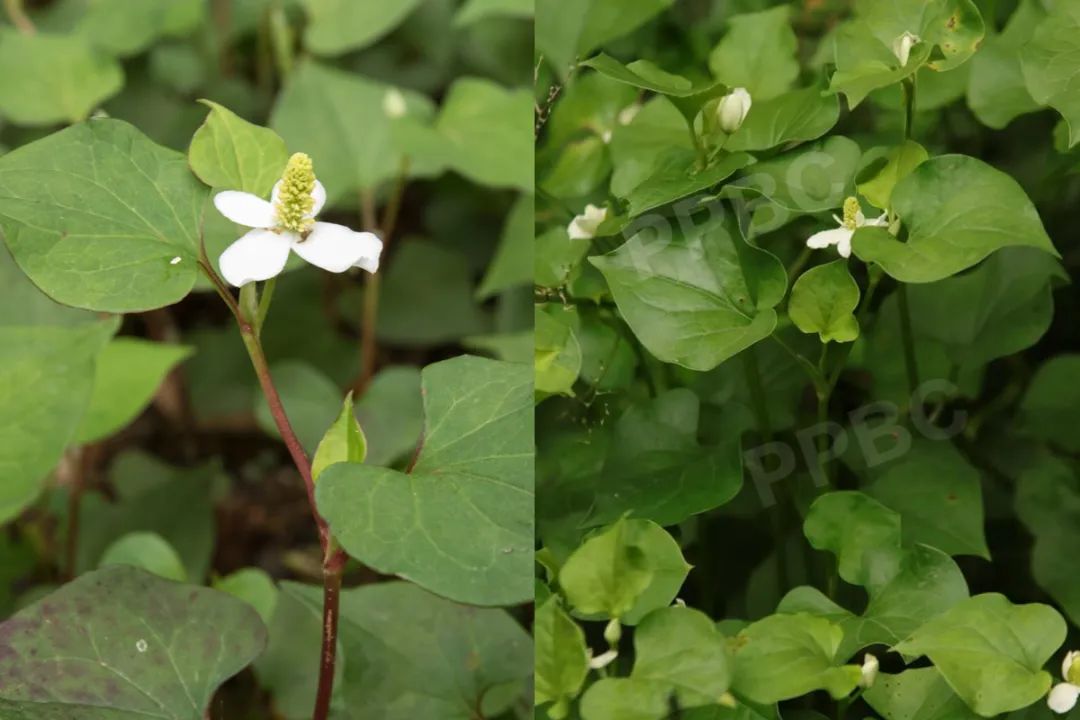 除了常见的折耳根(左)外,在四川峨眉山区域,还分布着一种峨眉蕺菜(Houttuynia emeiensis),其习性和特点与折耳根类似,最大的区别是它全身都是绿色,不会有紫色的茎叶(图片来源:Wikimedia Commons&李策宏@PPBC)