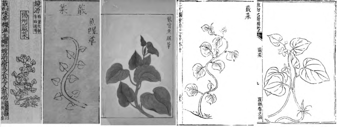 各代医药典籍中的折耳根图像。在很多地区,折耳根还有“猪屁股”“猪鼻孔”“猪茶”等称呼,应该也是从“蒩”演化而来(图片来源:鱼腥草的图文书写与本草知识建构[J])