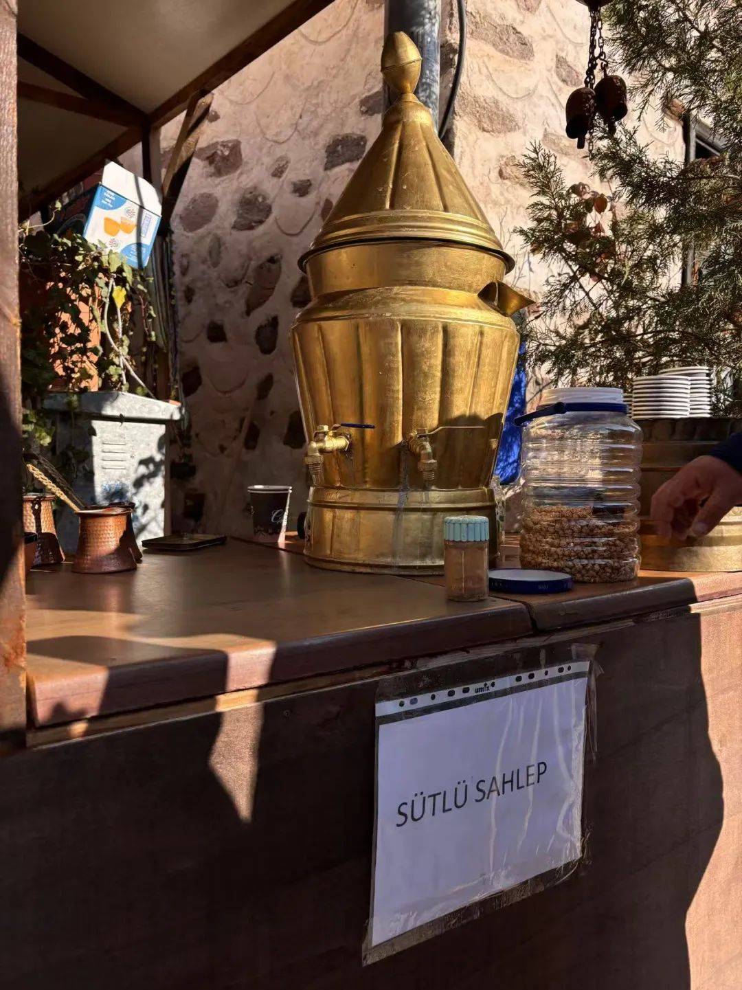 离开教堂,我沿河步入镇中,仿佛挣脱了历史厚重的威压,脚步都轻快起来。清晨微润的空气中,铺面大多已经开张,纪念品商店外挂着一串串“恶魔之眼”,而餐厅外摆区则大多提供两种饮料——味道令人苦不堪言的土耳其咖啡,和一种酷似麦芽糊精的本地饮品萨勒普(Salep)。后者的主要成分是兰花块茎磨成的粉末,冲入甜牛奶后,还会撒上肉桂粉作装饰,喝起来黏糊糊又暖呼呼。