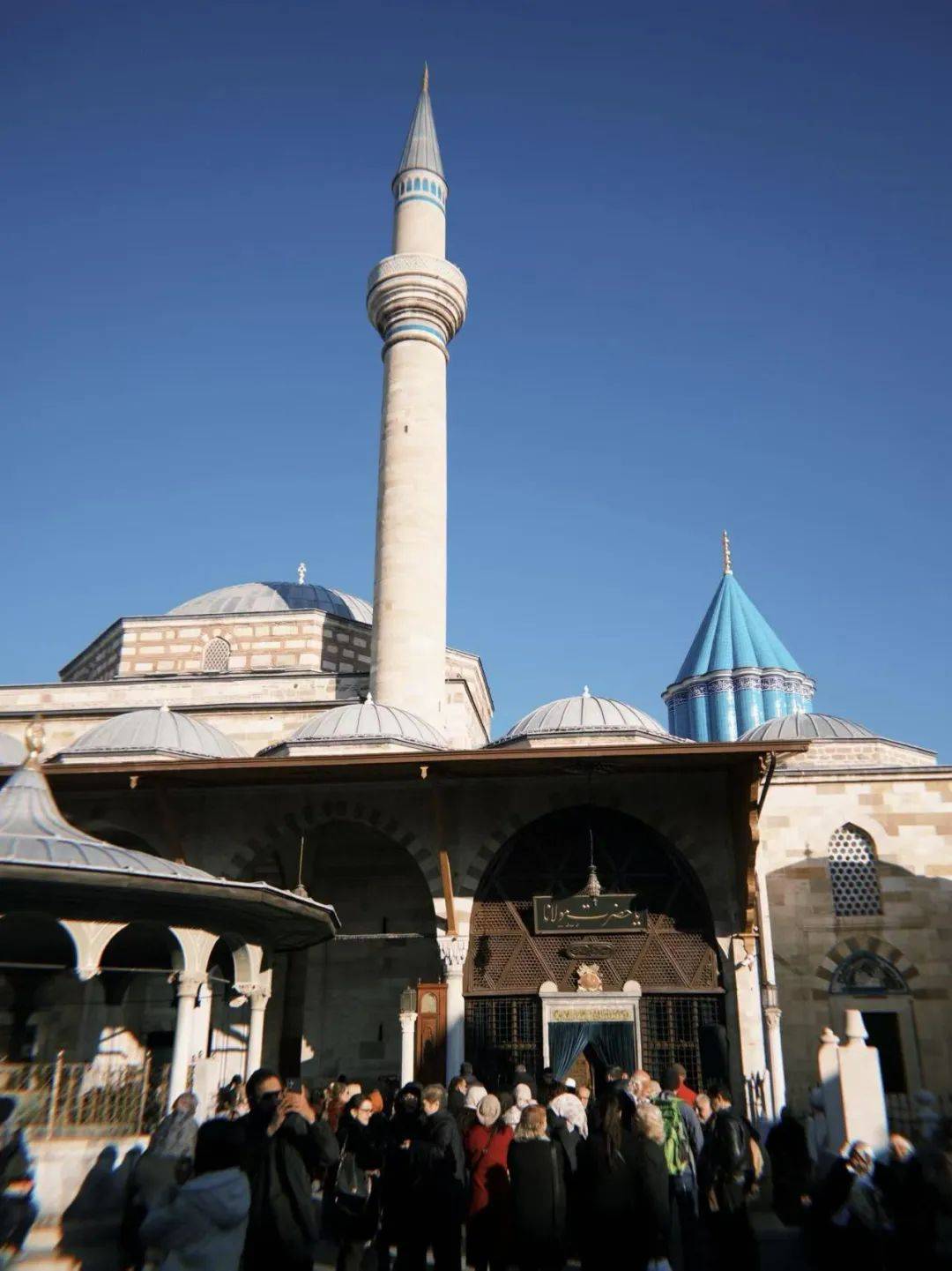 12月17日的午后,我们也依约来此。这天阳光正好,气氛欢欣,覆盖着蓝绿色瓷片的绿穹(Kubbe-i Hadra)在蓝天的衬托下格外醒目。梅夫拉纳博物馆除了是鲁米的陵寝所在,也曾是苏菲派修士们的苦修之所。向导带我们从“一刀两断门”(Kustahan Gate)进入。据说,过去修士们若从此门离开,就代表着他重回俗世,与教派再无关联。
