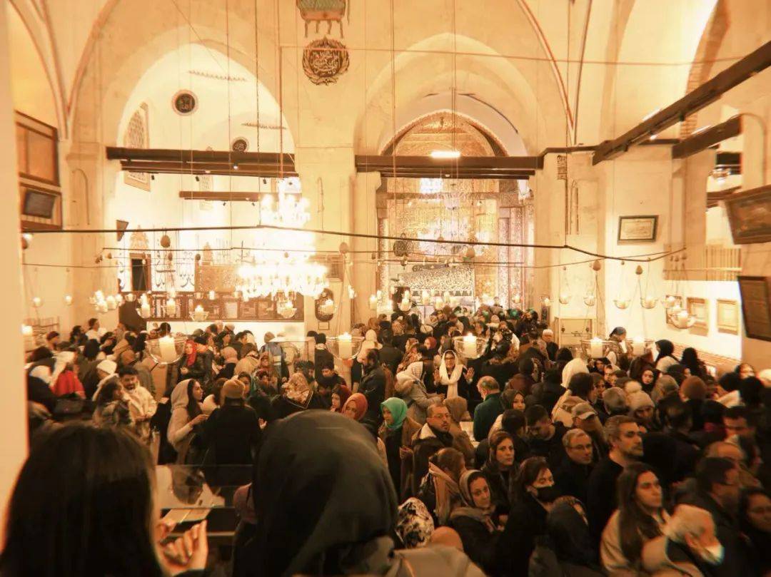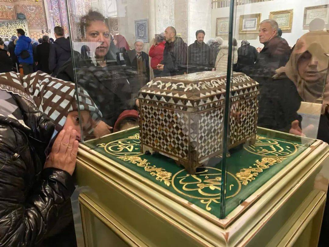 仪式结束后,我跟随着推搡的人流向出口走去,这一路并不太顺利,因为有太多信徒不舍离去。另一相连的厅中摆放着鲁米生前穿过的僧袍和使用过的器具,还有一个镶嵌螺钿的宝匣中据说存放有他的须发。玻璃展示柜一角留有气孔,因此我们看到了一个神奇的景象:人们绕柜而行,随后紧贴气孔嗅闻。