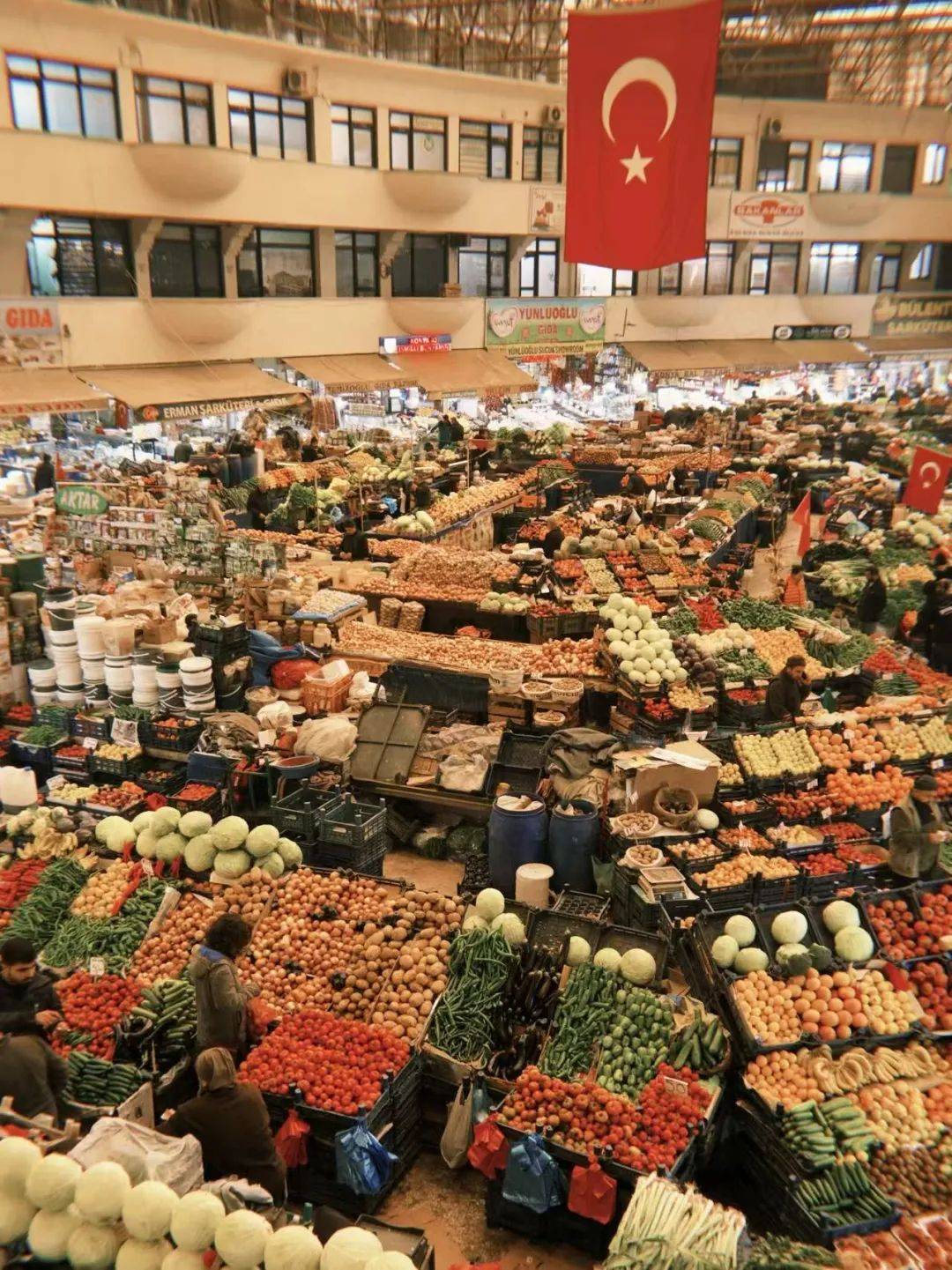 也许全世界游客对出片的追求大多一致,本地向导带我们来到市场二楼的一处平台,这里是外国社交平台上的网红机位所在,能一览全景。码放整齐的蔬果,和色彩盘里的颜料块别无二致。走在巴扎里极易迷失,到了高处才发现一切闹中有序。