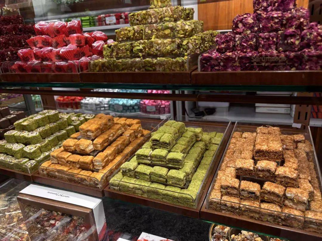 不过这种“伸手”行为,在孔亚逛过几个街边的甜品店后,戛然而止。虽然旅途中我们在餐厅已经对土耳其甜品的甜度有了敬畏之心,但在甜品店里晃过一圈后,仍有了血糖爆表的感觉。如果甜度有等级,土耳其甜一定是“-est”级,无论是开心果制作的知名甜品巴卡拉瓦(Baklava),或是土耳其软糖,吃完以后,都甜得人脑子发蒙。