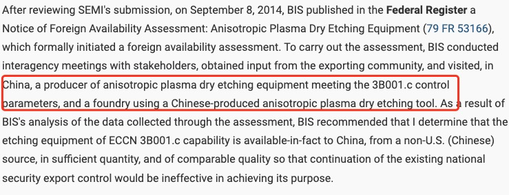 2015年的声明是美国迄今唯一一次“让步”,原因也很朴实:“有一家非美国公司已经有能力供应足够数量和同等质量的刻蚀机。”