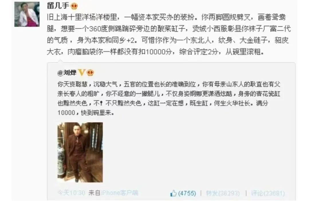 除此之外,当年凭借微博整火爆火的“火华社社长”刘烨、主持人杜海涛、演员陈赫都跑到@留几手微博下方求打分,陈赫成了帮@留几手修脚蹬子的0.5分汽修男,刘烨则是“资本家买办装扮的袜子厂富二代”,喜提2分。