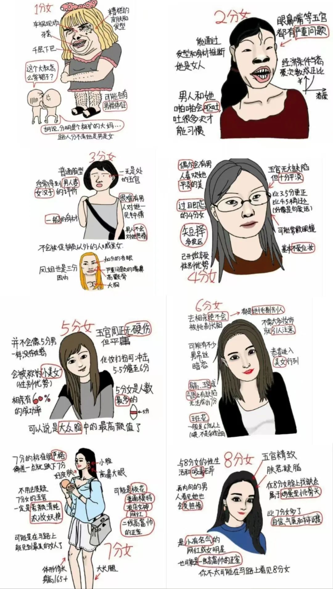 在这些画像中,“1分女”通常体型偏胖,戴牙套、双下巴,令人分不清男女;普通女生则通常在2-3分;4分女是“过目即忘”,但开始享受性别优势;从5分女开始,是大家争论的重点,5分女是小美女,6分女是班花级,7分女是“路上最美的路人,二线高富帅的正室”,8分女则是明星级,“再内向的男人看见她也会变热情”。