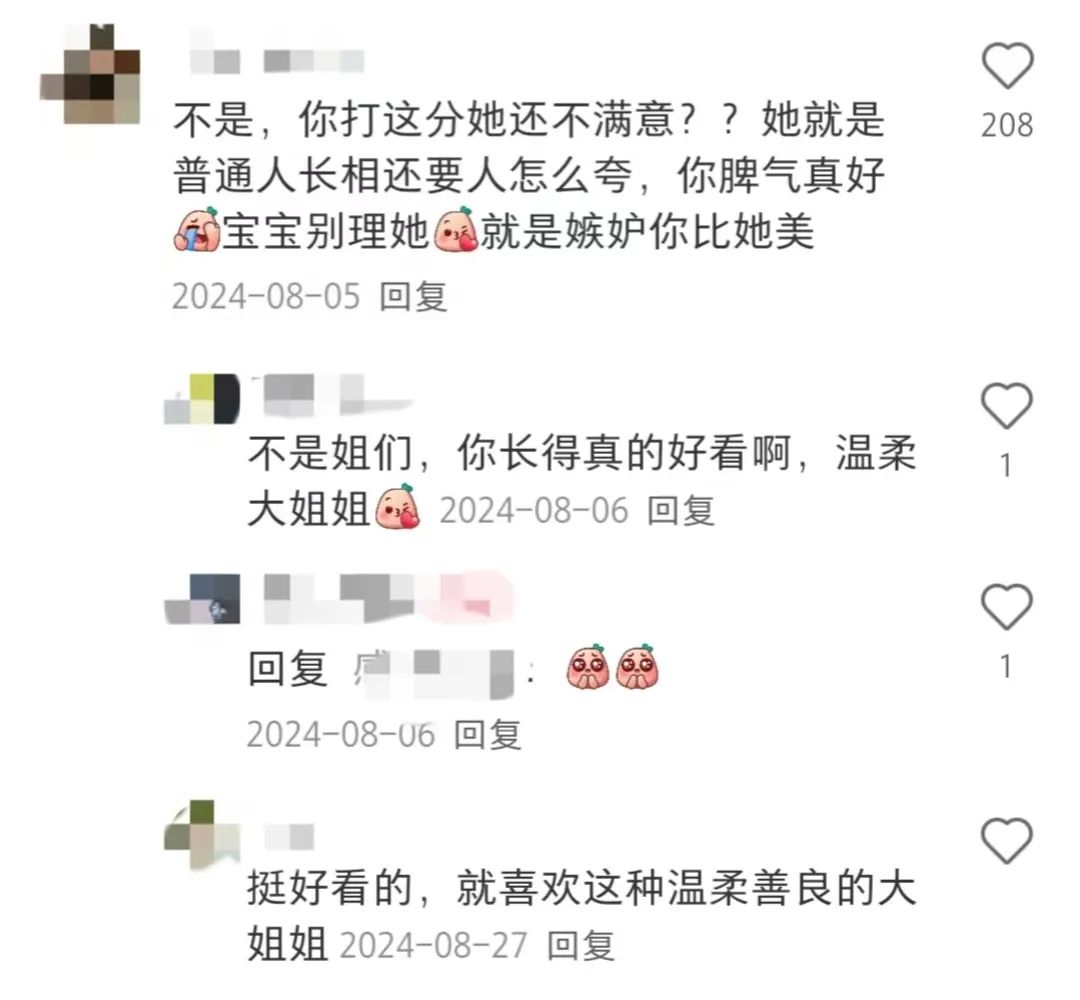 这些小红书上的“打分博主”相比战斗在微博的@留几手,抖音锐评的@ay更柔和,网友们一般都会得到比预期高的分数,就算分数偏低,也不会被锐评,而是会得到网友们的安慰,评论区大多是“没事宝宝”“你再调整xxx就更美了”......