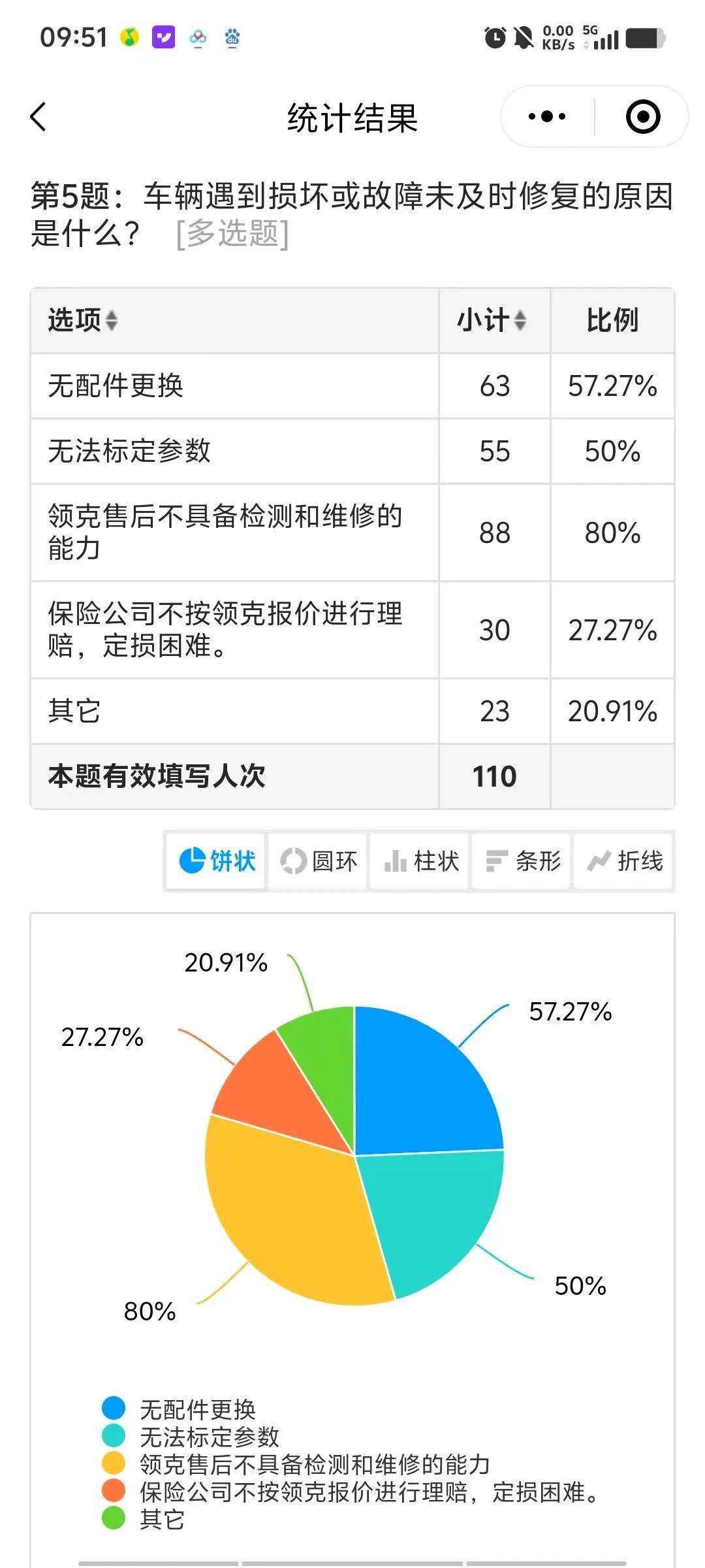 对于车辆遇到损坏或故障未能及时修复的原因,投票结果显示,领克不具检测和维修的能力、无法更换配件,无法标定参数等原因排在前三位。