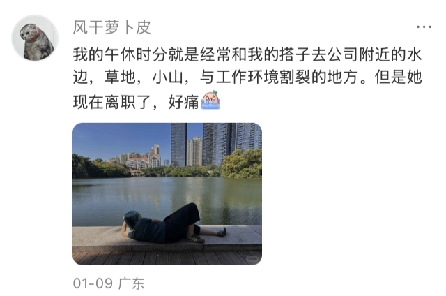 午休游玩选手也分了很多流派,但大家都在借助公司地缘优势肆意发挥。有的喜欢在午休干饭之后,与吃饭搭子共同前往公园、江水边散步......有的会在市中心浅浅citywalk一下;还有的会在午休时间逛个小景点,听一场讲解。