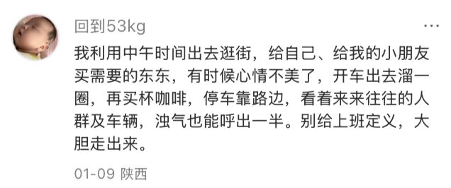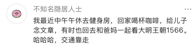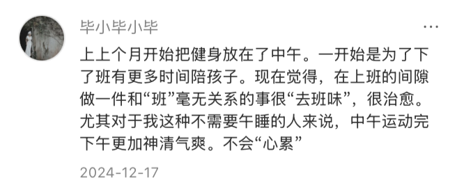 “最初中午健身开始是为了下班有更多时间陪家人,但我为啥不中午直接回家呢?想通了之后隔三差五回家陪父母过中午。”