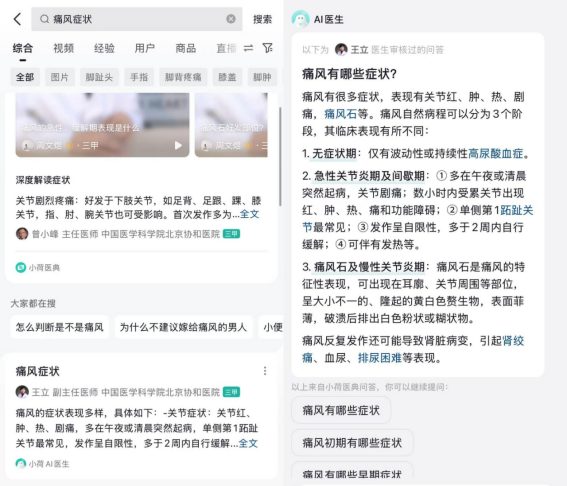 图注:在抖音搜索“痛风症状”,可以看到AI医生的回答 图源:字母榜