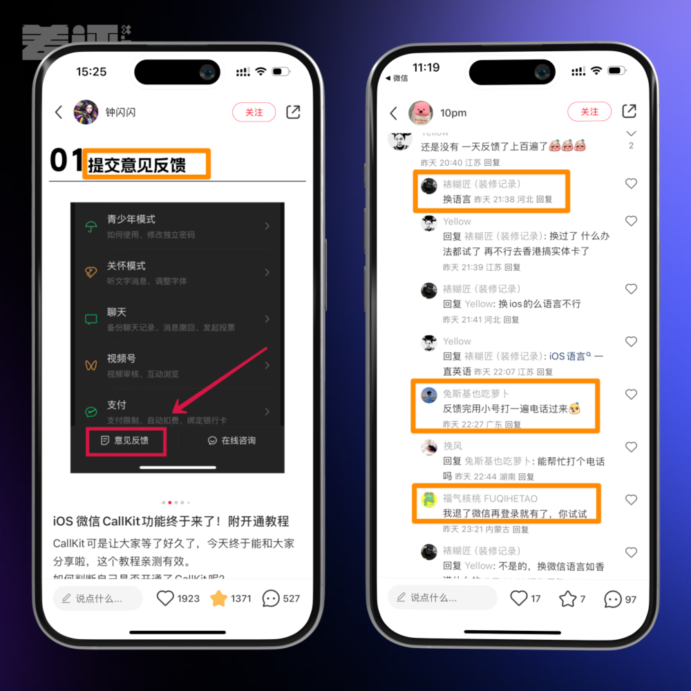 甚至有人做了一个 9 张图的教程,让网友去给微信提交一个反馈,然后在反馈中填写意见:为什么我还没有 CallKit 。