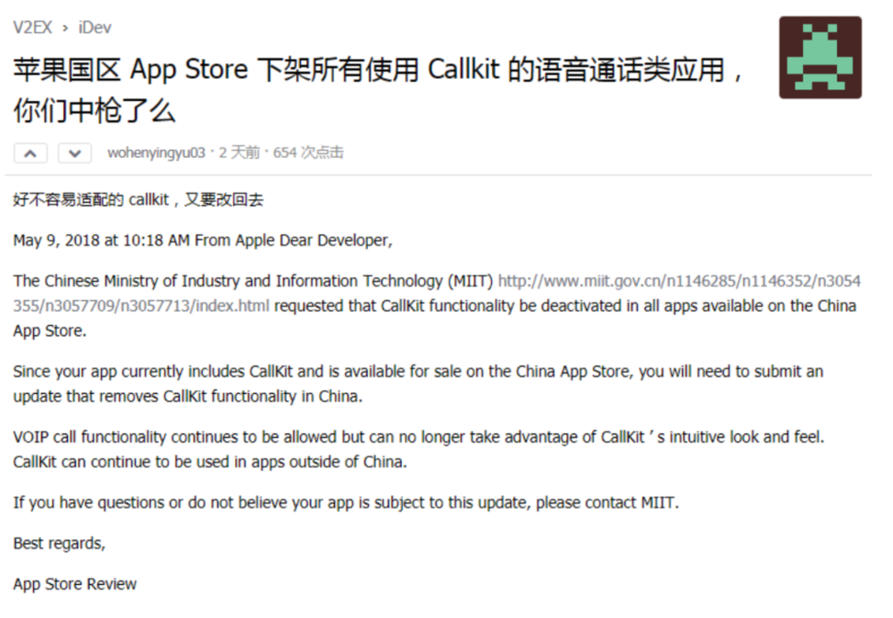 2018 年 5 月, V2EX 论坛就有开发者说自己收到了苹果邮件,自己 App 里 CallKit 功能要删掉了。因为根据工信部要求,中国应用商店的所有应用程序中要停用 CallKit 功能。