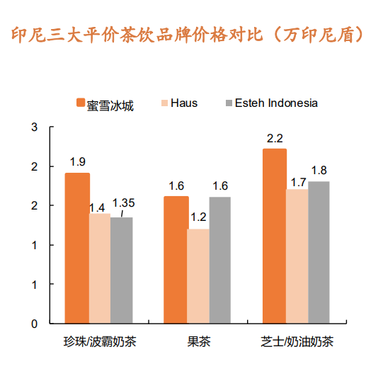 以冰淇淋和柠檬水标准杯为例,蜜雪冰城在越南的定价为3-6元,印尼为3.7-4.6元,价位与奈雪的茶、喜茶等中高端品牌拉开差距。但是论低价,蜜雪冰城比不过本土品牌,以印尼为例,本土茶饮品牌Haus和Esteh Indonesia均面向中低端市场,Esteh Indonesia平均定价比蜜雪冰城低0.5-1元,已跻身东南亚茶饮行业前三;印尼另一茶饮品牌Haus的性价比更高,多款产品定价仅为蜜雪冰城的一半。