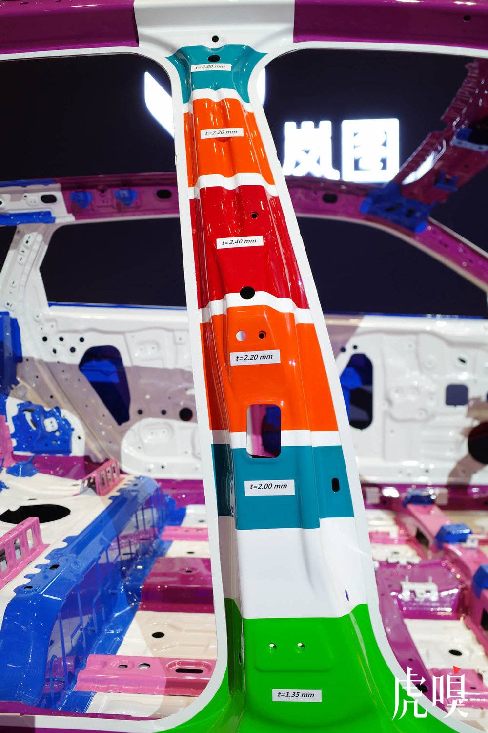 这个五彩斑斓的 B 柱:不同的颜色,表示各部分不同的厚度(上面标的很清楚)。岚图这辆车的 B 柱和 A 柱内衬板应用了 TRB 不等厚板技术。即在钢板轧制过程中,按预设调整轧辊间距,来获得厚度变化的钢板,再冲压成型,从而尽可能减少多余材料,减重且不降低原料硬度(具体参见《“滚粗”这门手艺,国产车也学会了》)。