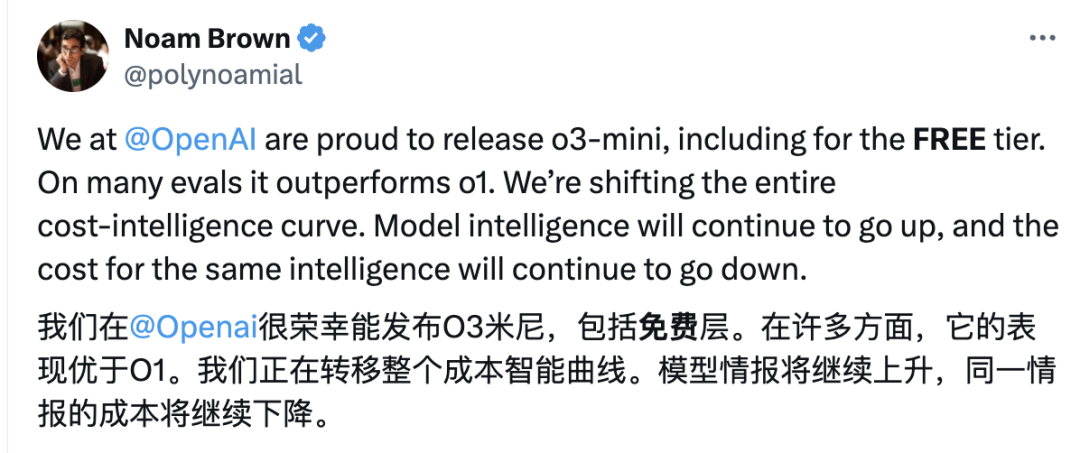 作为o1-mini模型的继任者,o3-mini是目前推理系列中最新且最具性价比的模型。OpenAI研究科学家Noam Brown在X平台发文称: