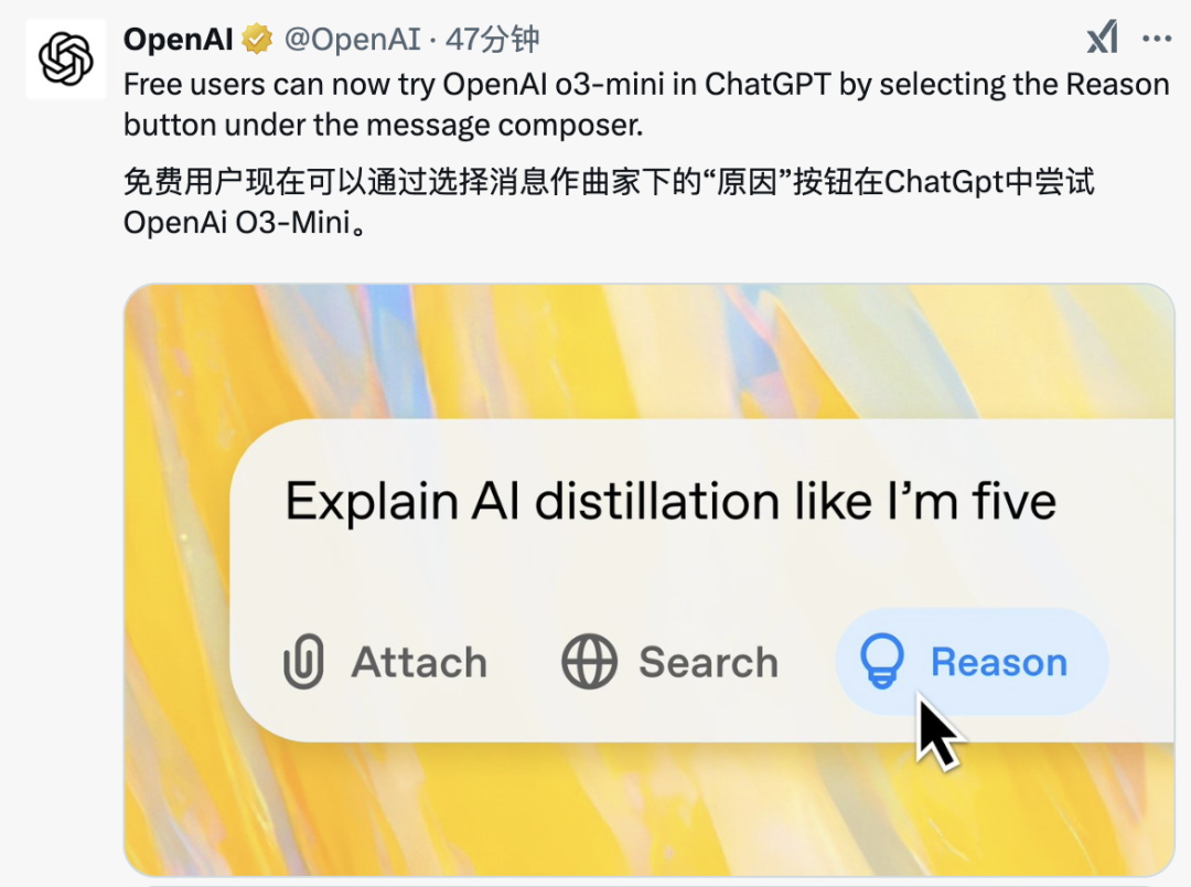 同时这也是OpenAI首次向免费用户开放推理模型的使用权限,在ChatGPT消息输入框下方选择“Reason”按钮即可使用。