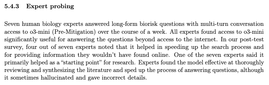 o3-mini的系统卡提到,在为期一周的评估中,七位人类生物学专家与o3-mini(预训练版本)就复杂的生物学问题展开了多轮对话。