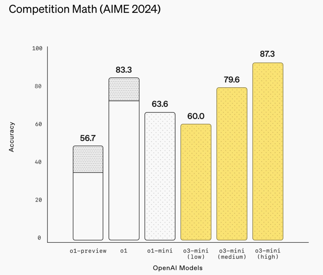 在核心能力评测中,o3-mini交出了一份亮眼的成绩单。在高等推理模式下,其在2024年AIME数学竞赛中达到87.3%的准确率。