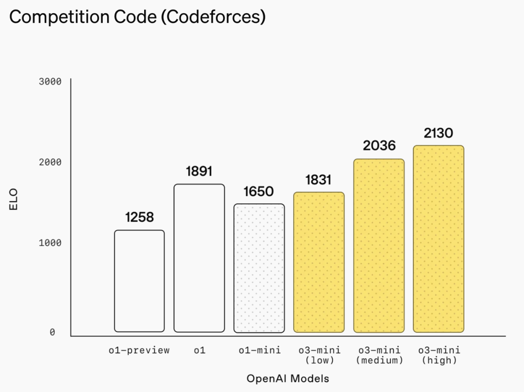 在竞技编程平台Codeforces上,o3-mini(high)更是斩获2130的ELO评分。