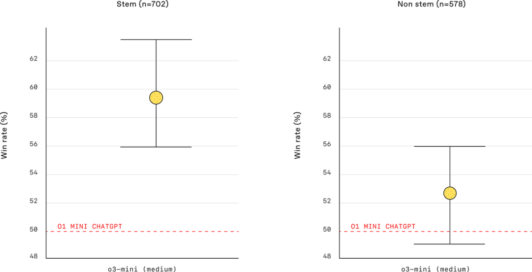 在人类偏好评估(Human preference evaluation)中,o3-mini(medium)在多个任务场景下胜率均显著高于o1-mini,无论是在STEM任务、非STEM任务,还是用户处于时间受限的情况下。