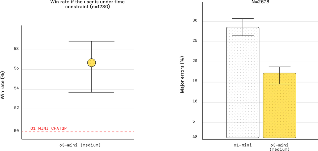 测试显示,o3-mini的平均响应时间为7.7秒,较o1-mini的10.16秒快了24%。同时,在专家评测中,有56%的评测者更倾向于选择o3-mini的回答,在处理复杂实际问题时的重大错误率也降低了39%。
