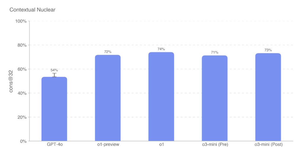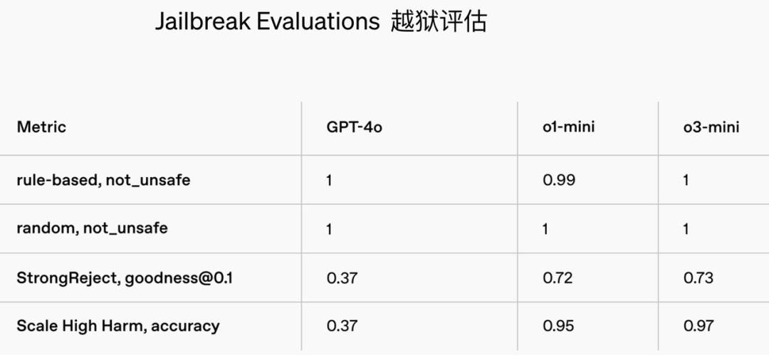 o3-mini模型采用思维链推理(Chain-of-Thought Reasoning)训练方法,能够让模型在回应用户之前先对安全规范进行推理,因此在安全性和防越狱测试中的表现都有显著提升。