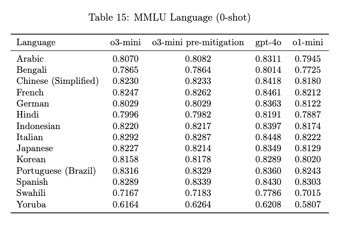 o3-mini多语言处理能力测试横跨14种主流语言,包括阿拉伯语、中文、法语、德语、日语和西班牙语等,较o1-mini有明显提升。