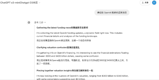 值得一提的是,OpenAI o3-mini集成了搜索功能,能够实时获取最新答案并附带相关网页链接,方便用户进行深度调研。