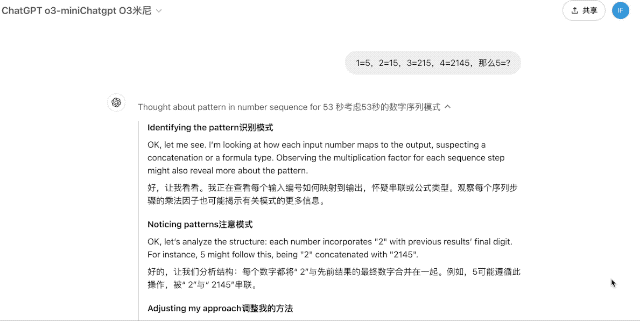 接着,我们抛出一道脑筋急转弯“1=5,2=15,3=215,4=2145,那么5=?”这道题有两种解法:从脑筋急转弯的角度看,既然1=5,那么5=1;从数学逻辑推理来看,答案应为21485。显然,o3-mini也没答对。