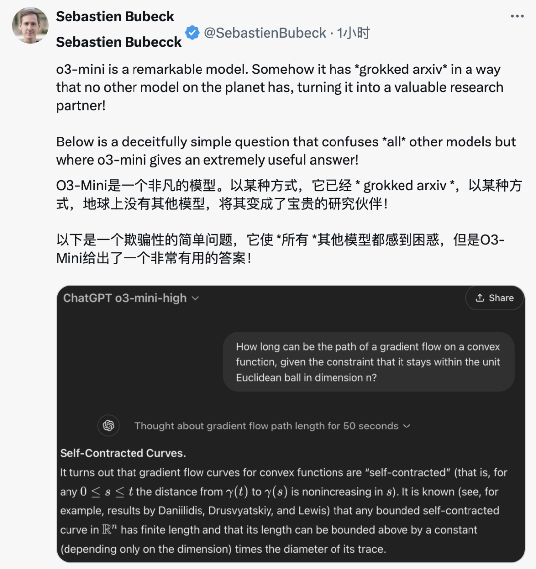 X网友问了一道关于凸函数的梯度流路径长度问题,o3-mini(high)成功经受了考验。