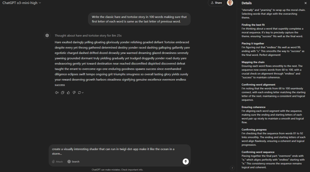 当被要求创作一个龟兔赛跑的故事,且需要遵循“前词尾字母等于后词首字母”的规则,并将篇幅控制在100词以内时,o3-mini(high)也交出了一份及格答卷。
