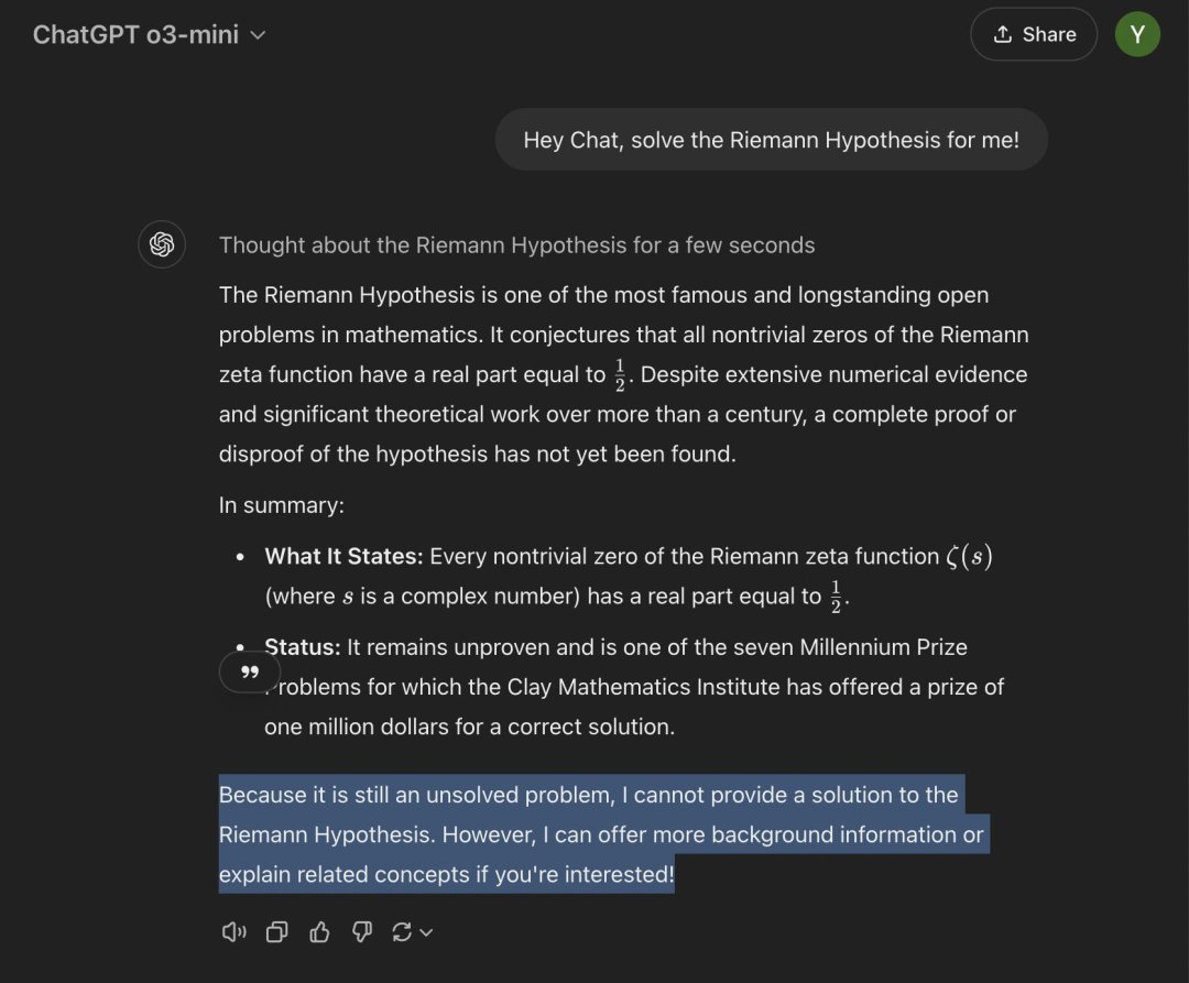 而有心无力的o3-mini也没上当,明确指出黎曼猜想仍然是数学界尚未解决的难题,因此无法提供一个正确的证明或反例。