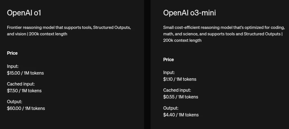 o3-mini的成本显著低于o1(约便宜13.6倍),缓存输入(Cached Input)的成本是标准输入费用的一半。