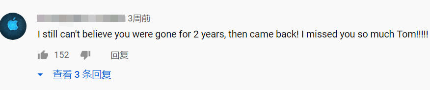 “我始终不敢相信你在消失两年之后又回归了!我非常想你Tom!”
