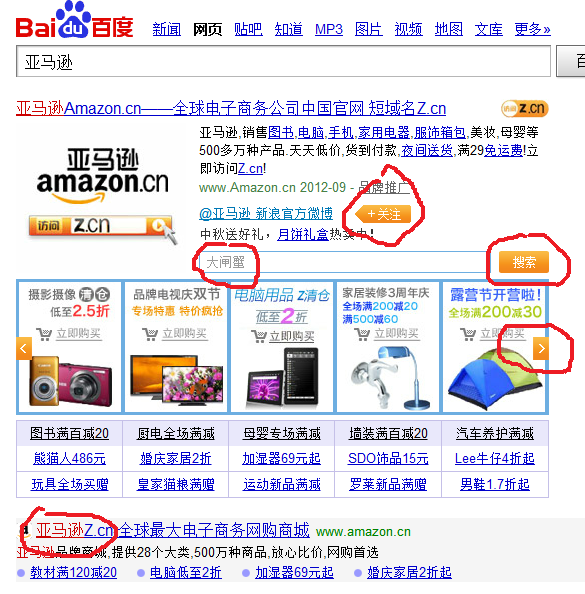 亚马逊一直在不遗余力的推广其短域名z.cn,在百度搜索页也不例外。因此在亚马逊界面上会看到两个域名网站,而且Z.cn出现了三次。作为全球的电子商务公司,在百度搜索页的方寸之间,亚马逊仍旧将品牌的塑造放在首位,“全球电子商务公司中国官网”作为对亚马逊的诠释。将亚马逊新浪官方微博植入百度搜索页是亚马逊的一大特色,用户只要有意或无意点击“关注”按钮,即可成为亚马逊的粉丝。但即便如此,亚马逊粉丝在五大网上商城里面是最少的,目前只有20万左右,比起京东商城的190万粉丝而言,相差甚远。也难怪亚马逊会在百度搜索页里会植入微博关注了。亚马逊的另一特色就是在百度搜索页中置入自己网站搜索引擎。用户只要在此搜索框录入想购买的商品,就可以不用去亚马逊的主页或促销页,而直奔要购买商品的界面,这样可以节省用户点击数及时间了。而在搜索框中置入大闸蟹,似乎更符合中秋节大众的消费热点。