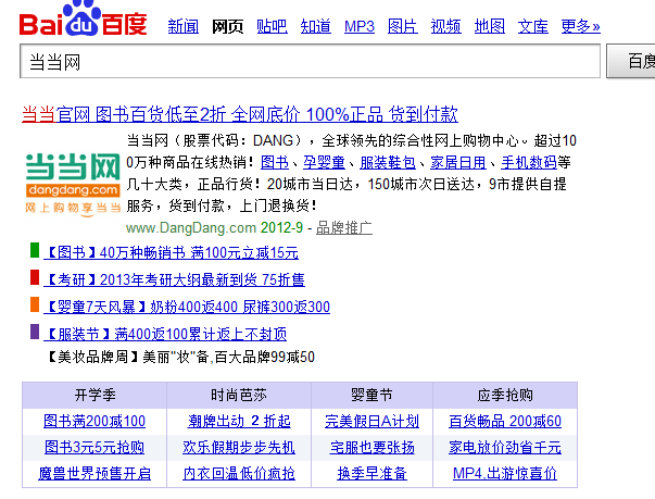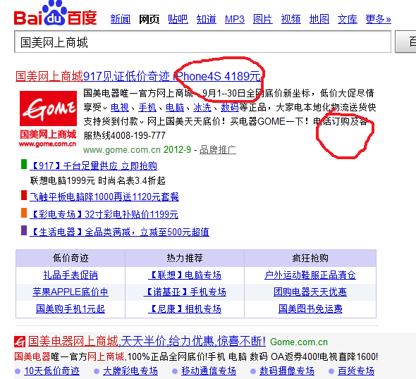 国美网上商城与当当网的搜索页促销信息展示很接近。促销信息主要是用文字来体现,只是国美重在价格促销,而当当网重在应季促销。同时两者口号也见端倪。当当的口号“图书百货低至二折,全网底价,100%正品,货到付款”,当当网将促销信息与公司服务特色予以展示,相比国美的“917见证奇迹,iphone4s4189元”的纯粹的促销口号朴实得多。当然国美在搜索页有一大特色,就是将电话订购与服务热线予以展示。国美属于线上商城与线下大卖场相结合的方式,电话订购与服务热线对其线下大卖场有一定促销作用。因此这也是国美线上与线下融合的一种表现。