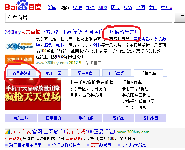 京东商城搜索页口号“360BUY京东商城官方网站 正品行货 全网底价百庆底价出击”京东在口号中有公司定位及促销定位。京东在上月经历价格战后,似乎改变了战略方针,对于促销,相比较苏宁的“0元购”朴实多了,而打出了“正品行货”口号,意在强调商品品质。初步显示京东也逐渐从价格战中回归理性。京东另一特色就是分类的促销信息采用标签式的,而且各标签是自动转换的,这样可以显示每一标签类别中最大的促销信息。当然,相比较亚马逊的展示量,还是显得少一些,但似乎展示得比亚马逊更多层次些。