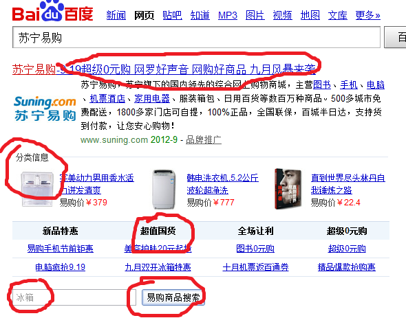 对于苏宁易购而言,百度搜索页就是促销平台,因此苏宁易购在百度搜索页口号“9.19超级0元购 网罗好声音 网购好商品 九月风暴来袭”。而对于分类促销信息,苏宁也用图片与文字链接予以展示。只是其并不能象亚马逊那样图片是可以点击展示的,因此展示的图片内容并不是很多,因此,图片促销信息,只是成为某个产品的展示季,而不是某类促销产品的展示季。因此展示的促销内容并不是足够多。当然在分类信息中有一栏标注着“超值国货”,与目前因钓鱼岛争端而引发的抵制日货活动遥相呼应。另外苏宁也象亚马逊一样将自家网站的商品搜索引擎植入进来,这样可以节省用户的时间与点击次数。当然搜索框默入“冰箱”似乎与九天的寒意似乎有点不协调。