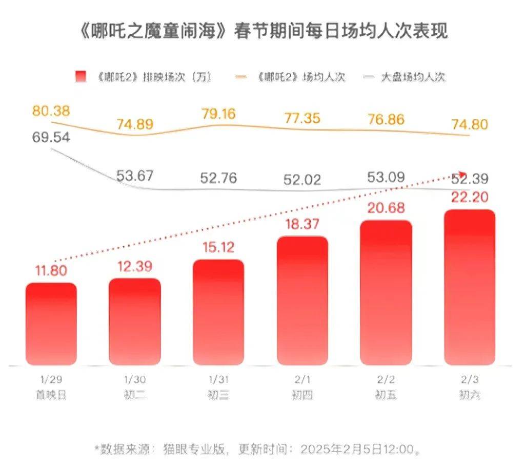 制作、剧情、精神内核毫无短板,豆瓣评分高达8.5分,口碑的爆棚让《哪吒2》收割了一众自来水。事实上,随着《哪吒2》的强势崛起,春节档的电影市场出现明显的虹吸效应。在经营导向之下,大部分院线和影院都为《哪吒2》增加排片,使之场次一路攀升,至年初七,《哪吒2》排片占比已经达到50%左右,较年初一增长近五成。