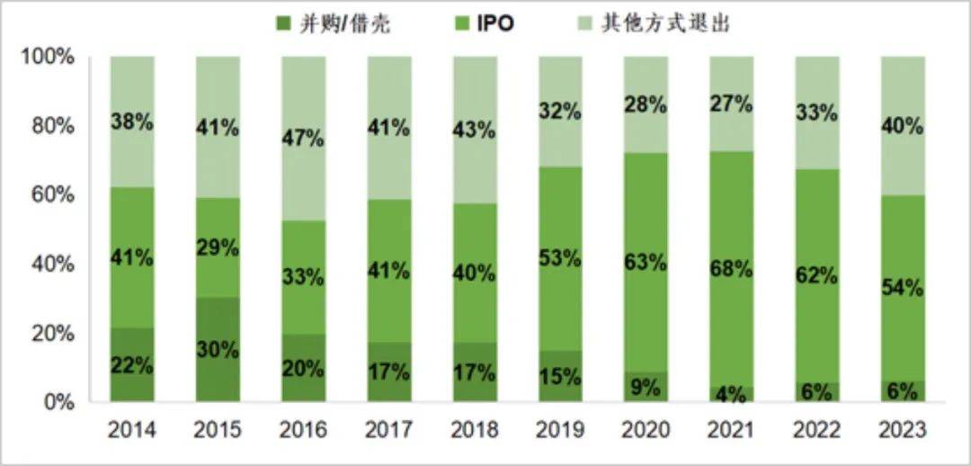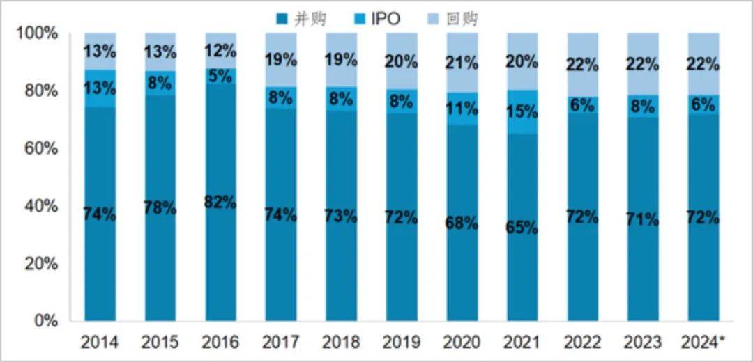 这张图是美国PE投资项目退出渠道的统计分析,最近3年每年通过并购退出的比例高达70%以上,而通过IPO退出的比例不到10%。