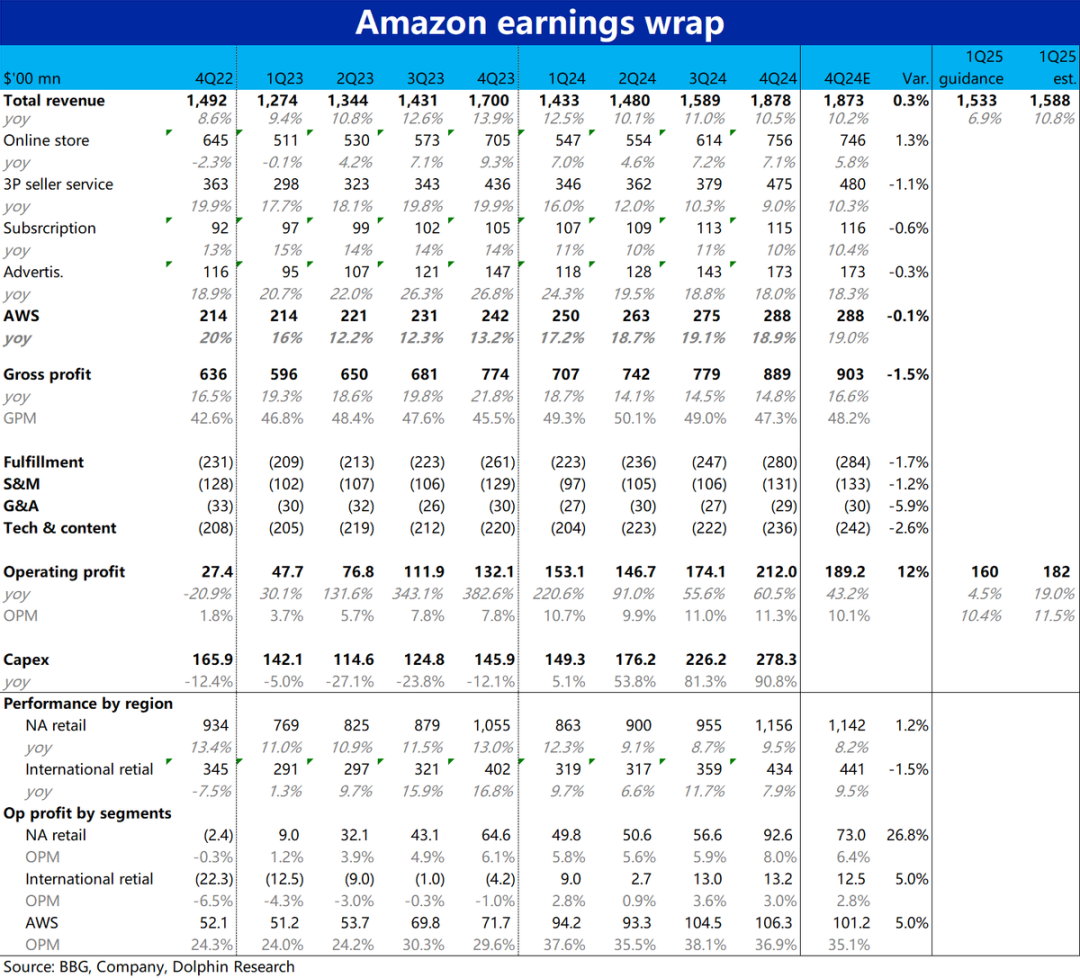 分板块看,前文已提及AWS云业务实际经营利润比预期高出约5亿美元,虽然利润率略有下滑,但相比预期要好些。