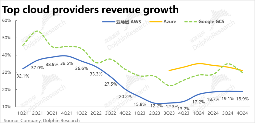 不过先前公布业绩的另两大云服务商,Azure和GCP本季的增长都双双明显减速,跑输市场预期,反映出云服务市场整体包括传统业务的需求并没有期待的那么强劲。当然单看AI相关需求,各家电话会中的表述普遍是需求很强,但受限于产能的供给不足。因此,AWS此次同样跑输预期,并不算很意外。甚至可以说AWS相比另外两大云服务商的差距在“比差”的环境中,是缩窄了的。