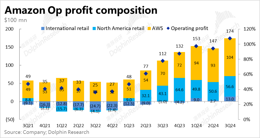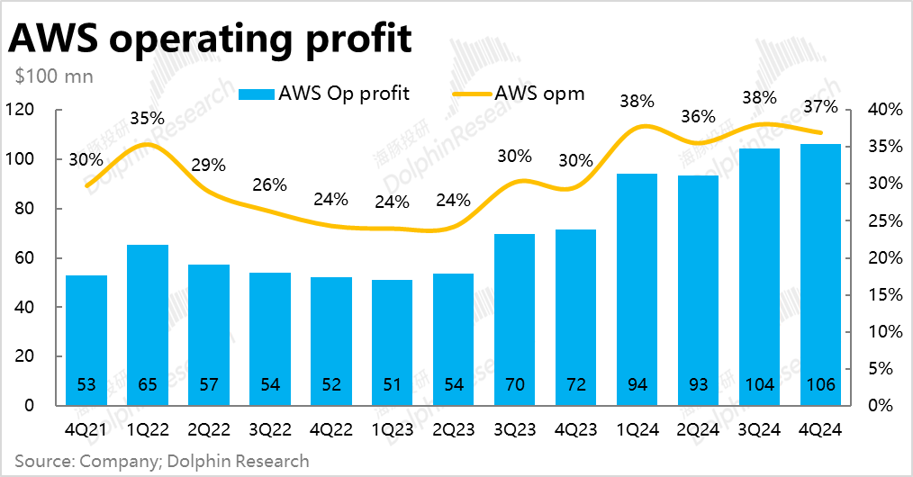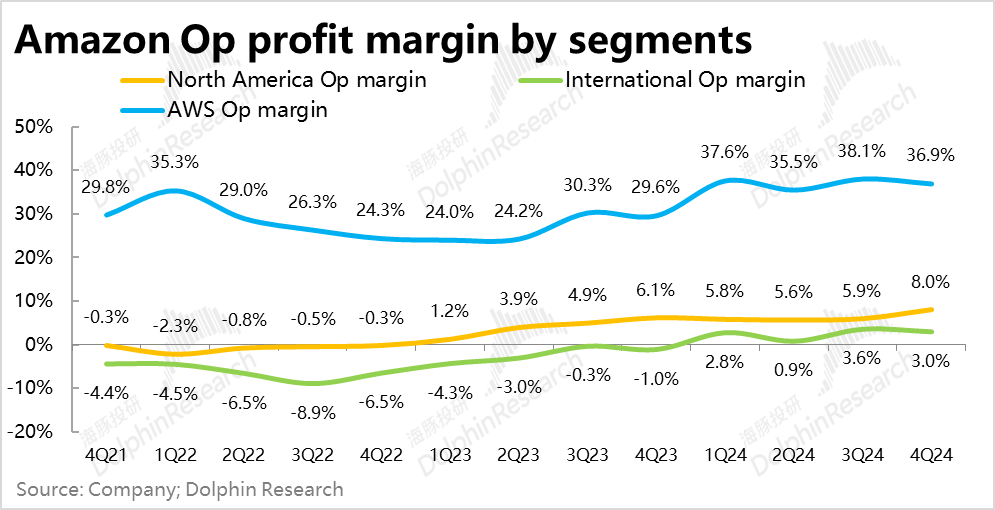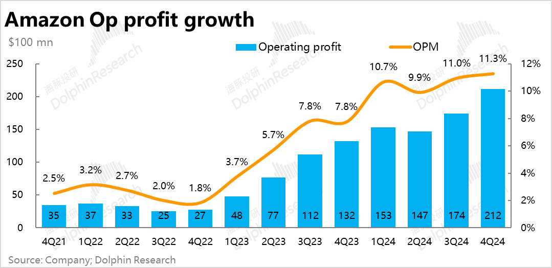 3. 本季亚马逊的利润依旧明显超出预期,整体经营利润达212亿美元,远超卖方预期的189亿美元,和先前指引上限的200亿美元。据我们了解,买方期待的表现也只是200亿美元以上,实际表现还是更好。整体经营利润率为11%,环比继续拉高了0.3pct。